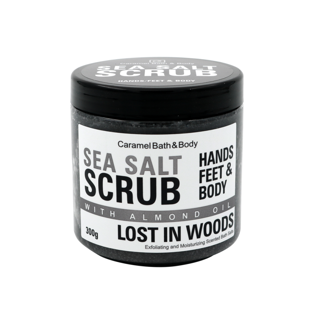 Sea salt scrub for the skin with natural ingredients and oils to remove dead skin with a mixture of sandalwood, pink peony flowers and apricot